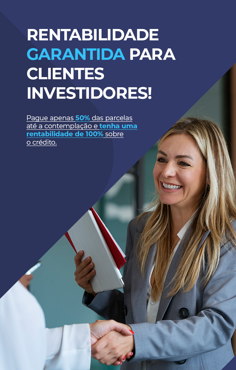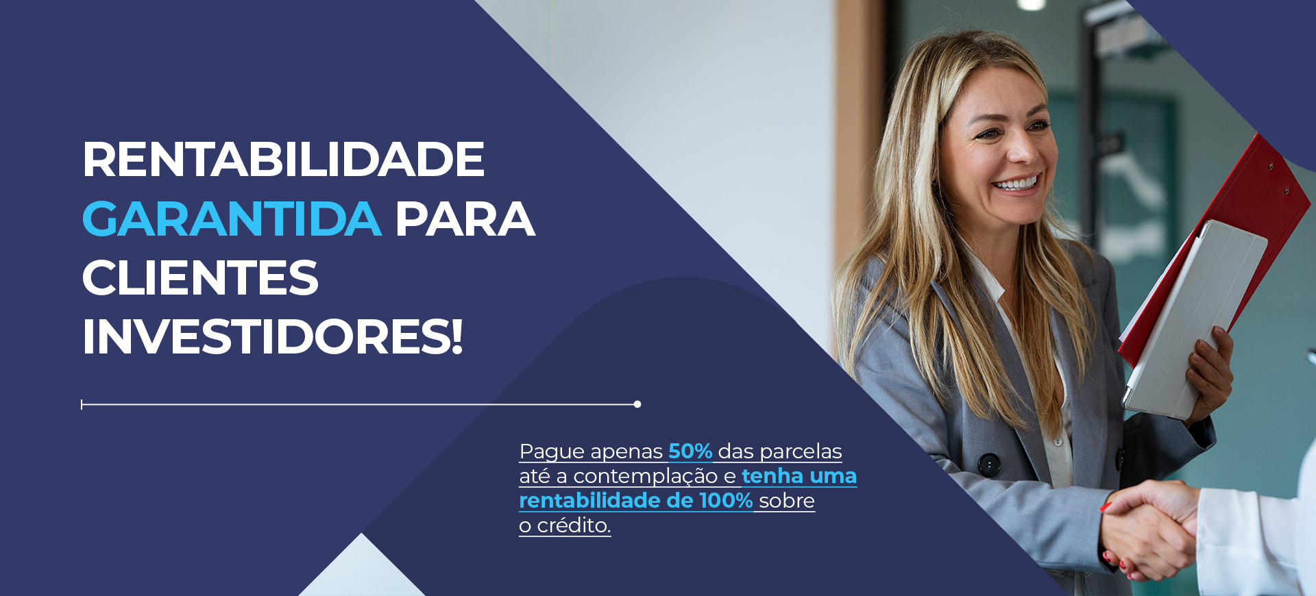 Ideal para clientes investidores, onde você tem a possibilidade de pagar 50 % de parcela ate a contemplação. Com uma rentabilidade de 100% sobre o crédito.